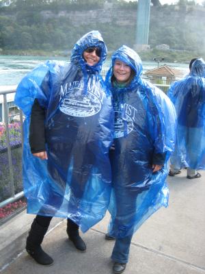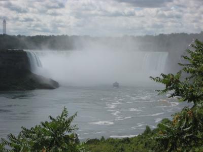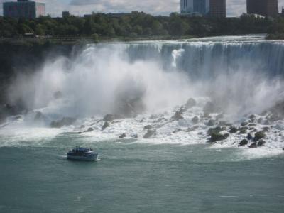 Nach dem wir angekommen sind, ging es gleich Richtung Wasserfälle. Da ich da schon mal war, war ich nicht so aufgeregt wie die anderen, aber auch nicht so "enttäuscht". Das Problem war, dass die meisten sich die zweitgrößten Wasserfälle der Welt viel größer und massiver vorstellen. Anfangs meinten noch einige so: "Das sind jetzt aber nicht die richtigen, oder? Da gibts doch noch andere." Nein, das sind die Niagarafälle. Die Kraft und die Massivität der Fälle kann man spüren, wenn man mit dem Boot namens "Maid of the Mist" in die Nähe der Fälle kommt. Bevor man da drauf kommt bekommen alle Regenponchos, weil das Wasser eine enorme Reichweite hat und man ohne einfach richtig durch wäre. Man fährt dann an dem kleineren Wasserfall vorbei zu dem Großen und während man dann davor steht und richtig nass wird kommt die Ansage: "Ladies and Gentlemen, this is Niagara Falls!".